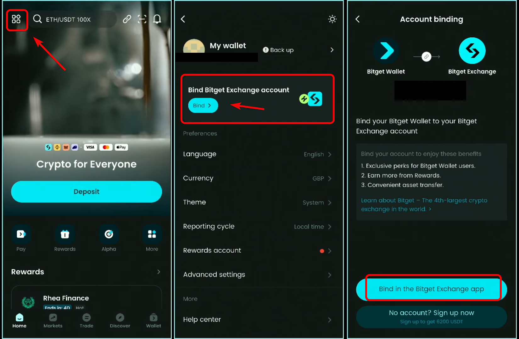 If you have an account on the centralized Bitget exchange, it can be linked to the wallet. To do this, on the main application screen, click the icon in the upper left corner and select the Bind Bitget Exchange account option.
