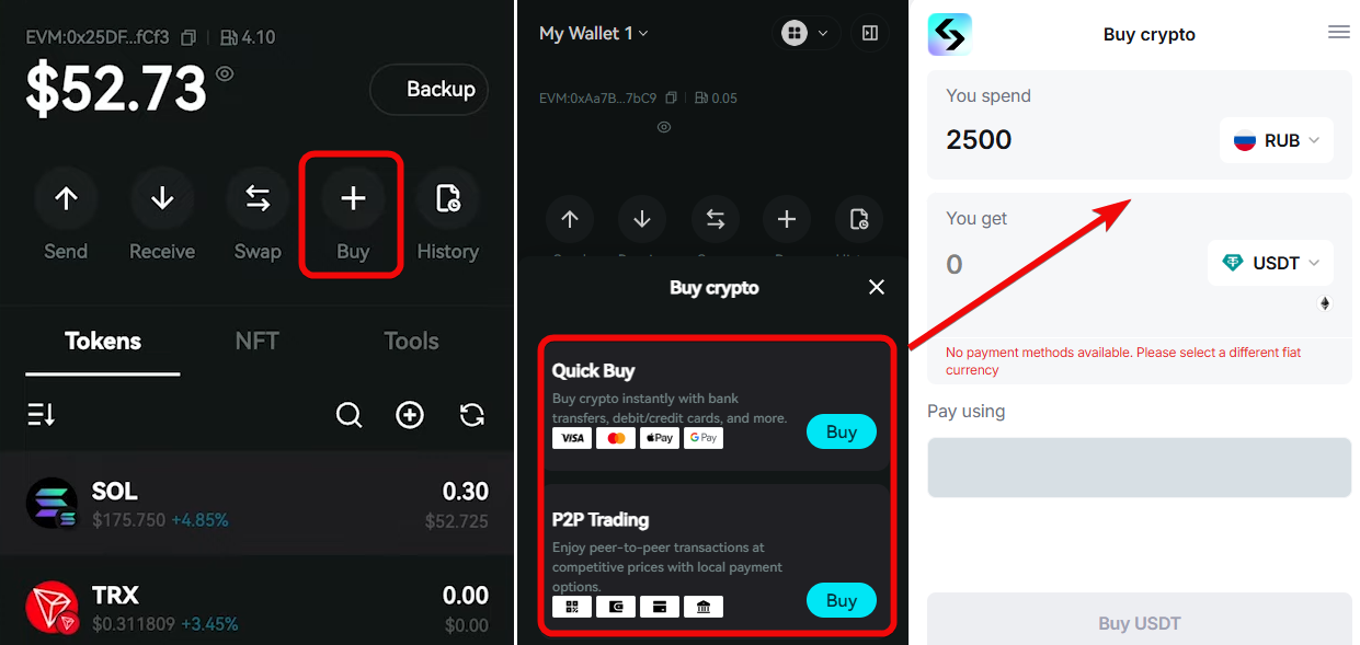 Instead of buying through the wallet, you can use the P2P trading function on the Bitget exchange or other exchanges without fees.