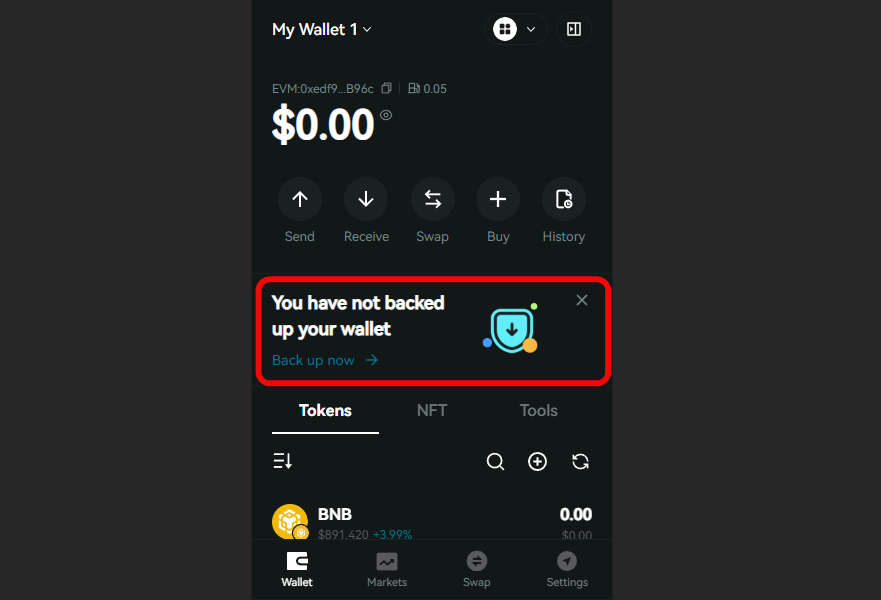 After entering the password, you will see a welcome screen and your wallet balance. However, we highly recommend first saving your seed phrase for recovery in case you lose access to the wallet.