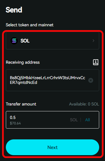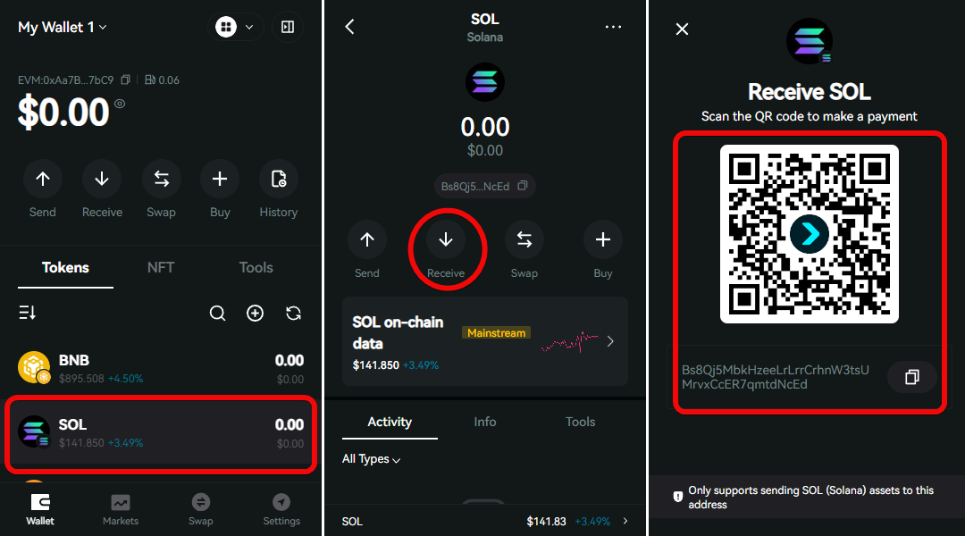 To top up the wallet, click the Receive button, select the network, for example, Solana, and copy the address or QR code.