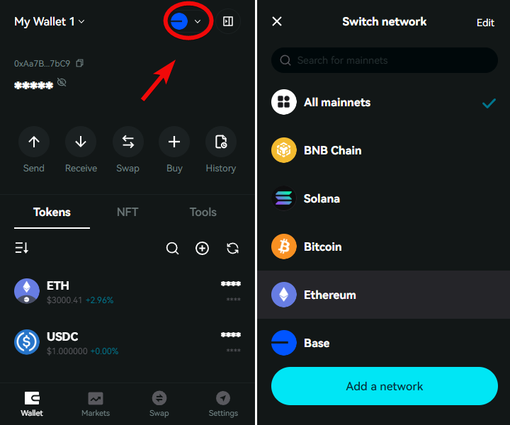These networks are called Layer 1 because other coins (like subnets) operate on them. Without a Layer 1 coin, you cannot send, swap tokens, or use its network - first, top up your wallet in the required network.