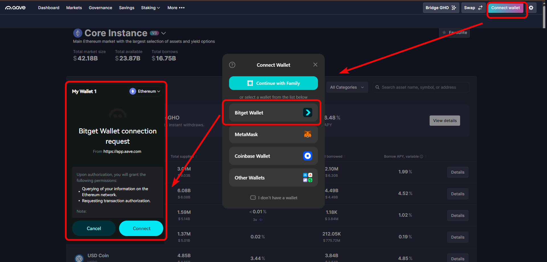 As an example, let's connect the wallet to one of the most popular DeFi protocols, AAVE. To do this on a web3 website:
