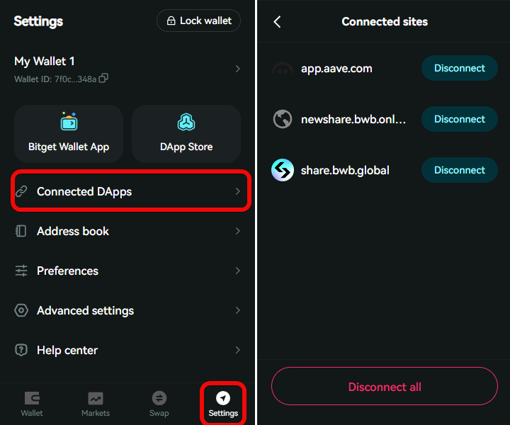 The wallet can be connected to any DeFi platforms. Why is this needed? For example, the built-in Bitget exchanger uses its own DEX but does not always offer the best exchange rate. Therefore, you can choose your own DEX or dApp.
