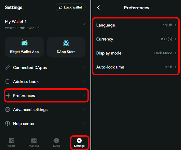 At the bottom, there are more settings for your wallet, for example, in which language and currency you want to display balances.