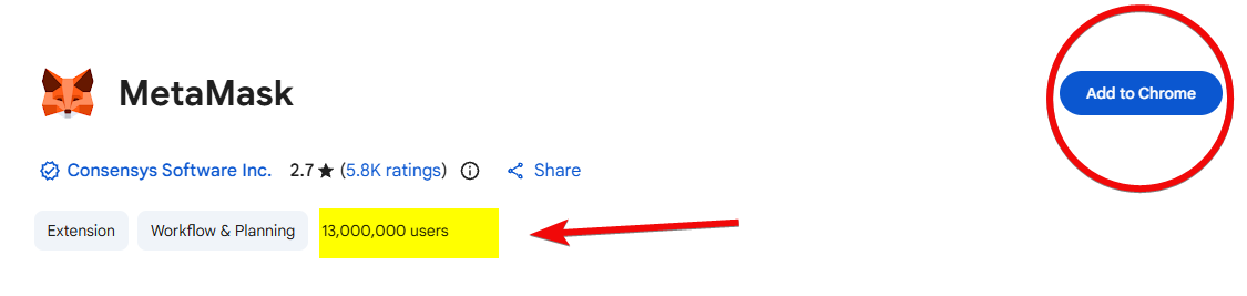 For security, only download MetaMask from the official website metamask.io. The official site will automatically detect your browser and redirect you to the installation page. This ensures you install the genuine extension with 13 million users, not a phishing one.