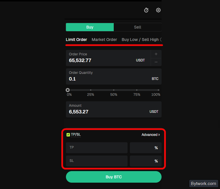 Соответственно панель размещения заявок находится справа, где можно выбрать эти типы ордеров, цену, количество и настроить TP/SL для спотовой торговли.