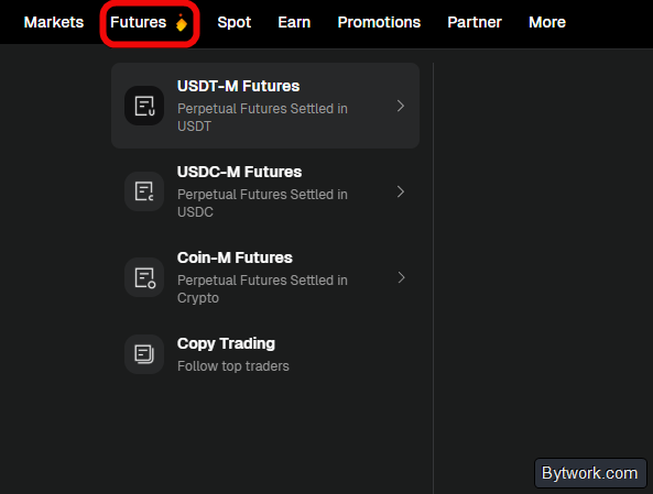 Для торговли с плечом сначала переведите средства со спотового счета на фьючерсный (например, USDT-M). Затем нажмите Futures, выберите торговую пару (например, BTC/USDT) и используйте рыночный или лимитный ордер, как и раньше.