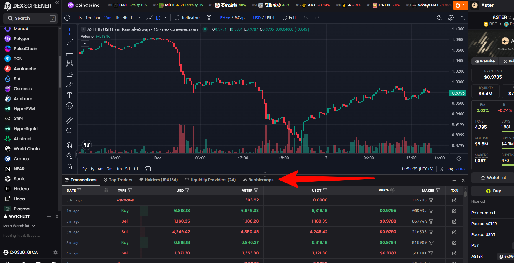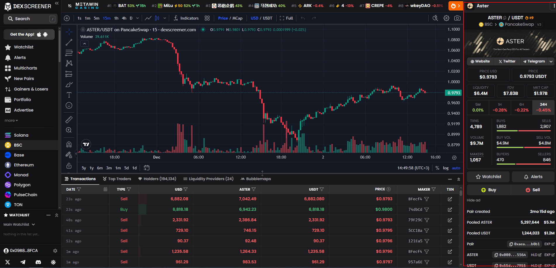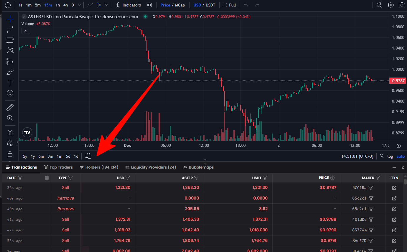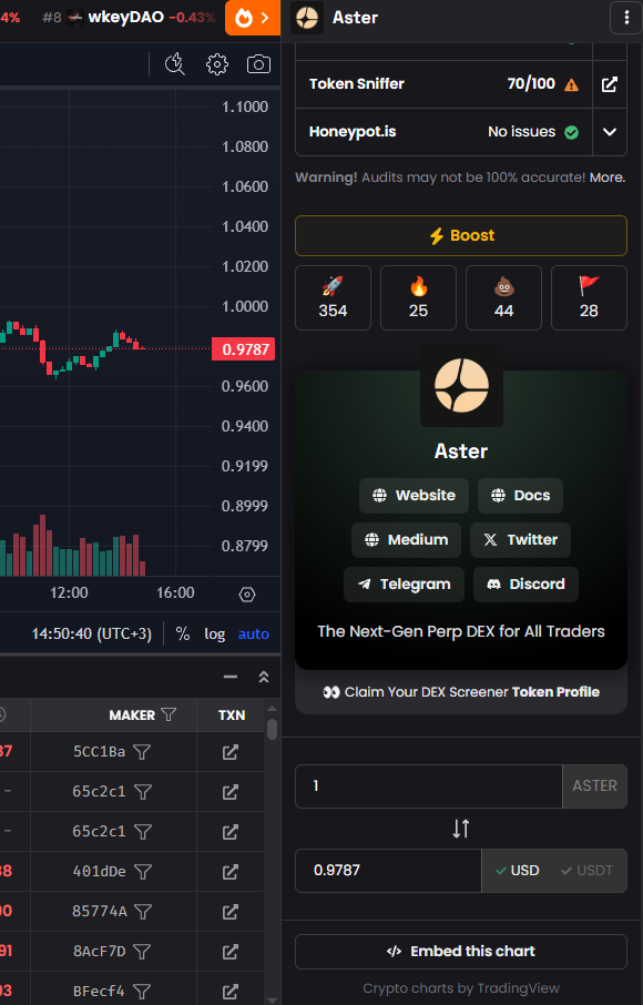- Объем: стоимость транзакции в USD, ASTER или USDT.