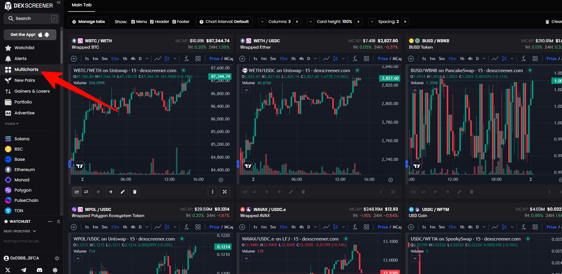 Функция Multicharts помогает инвесторам отслеживать и сравнивать несколько токенов одновременно. DexScreener позволяет открывать до 16 графиков одновременно с возможностью настройки макета (количества строк и столбцов), скрытия заголовков и нижних колонтитулов, а также перетаскивания для гибкого расположения.