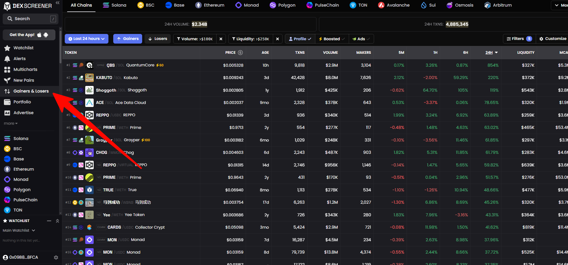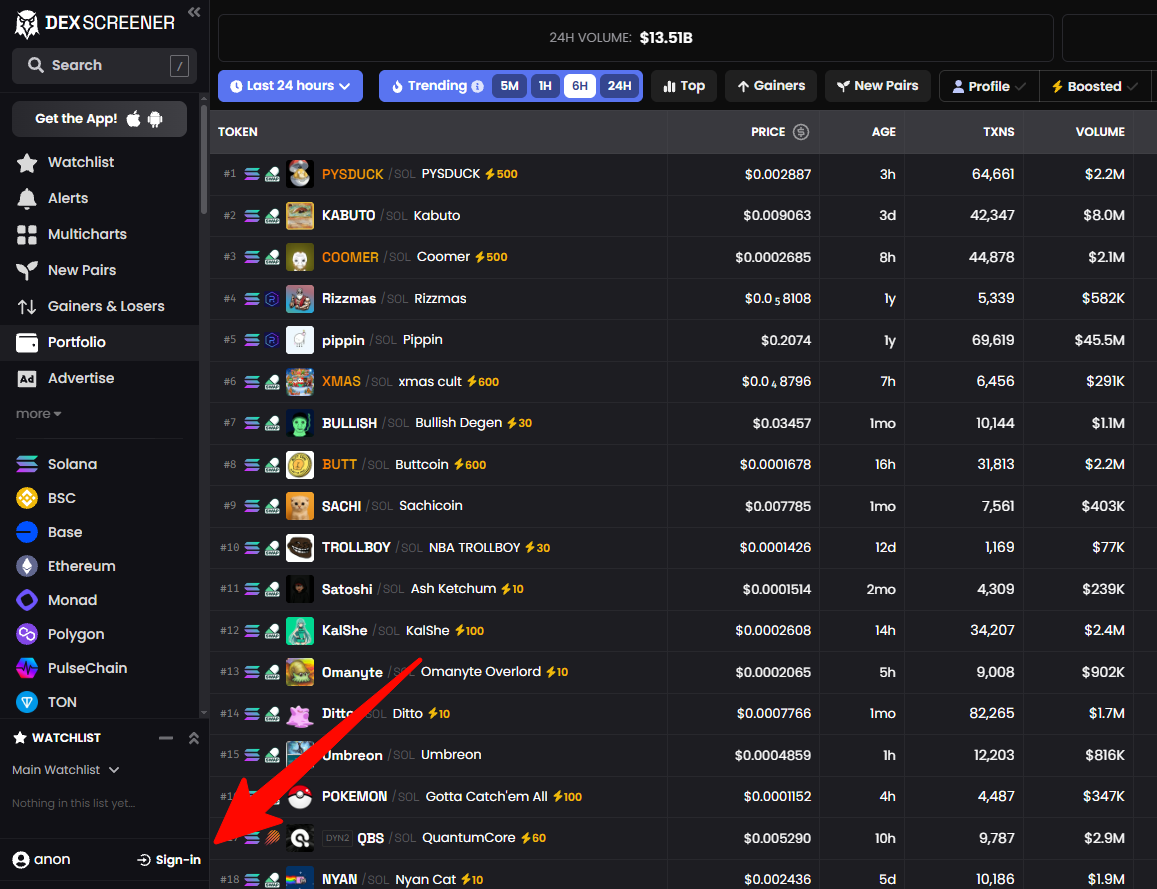 Раздел «Выросшие и упавшие» на Dexscreener помогает инвесторам быстро определить наиболее волатильных токены в краткосрочной перспективе.