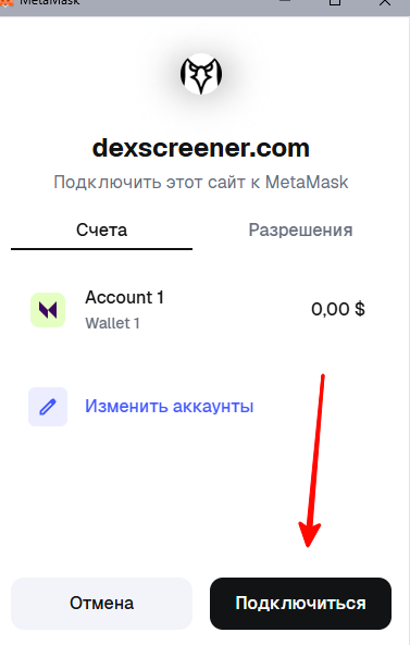 Рассмотрим на примере MetaMask. Нажимаем на него. Откроется всплывающее окно кошелька. Нажмите на кнопку «Подключиться».