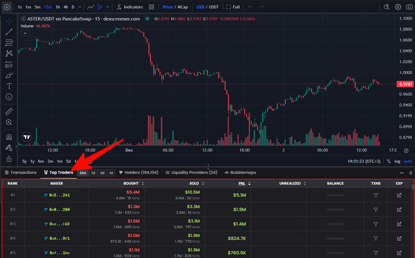 Раздел «Топ-трейдеры» отображает список кошельков с наибольшим объёмом торгов или наибольшей частотой торгов в паре токенов. Это позволяет инвесторам наблюдать за поведением кошельков с наибольшим объёмом торгов, особенно кошельков «умных денег», которые часто демонстрируют впечатляющую прибыль и эффективные стратегии.