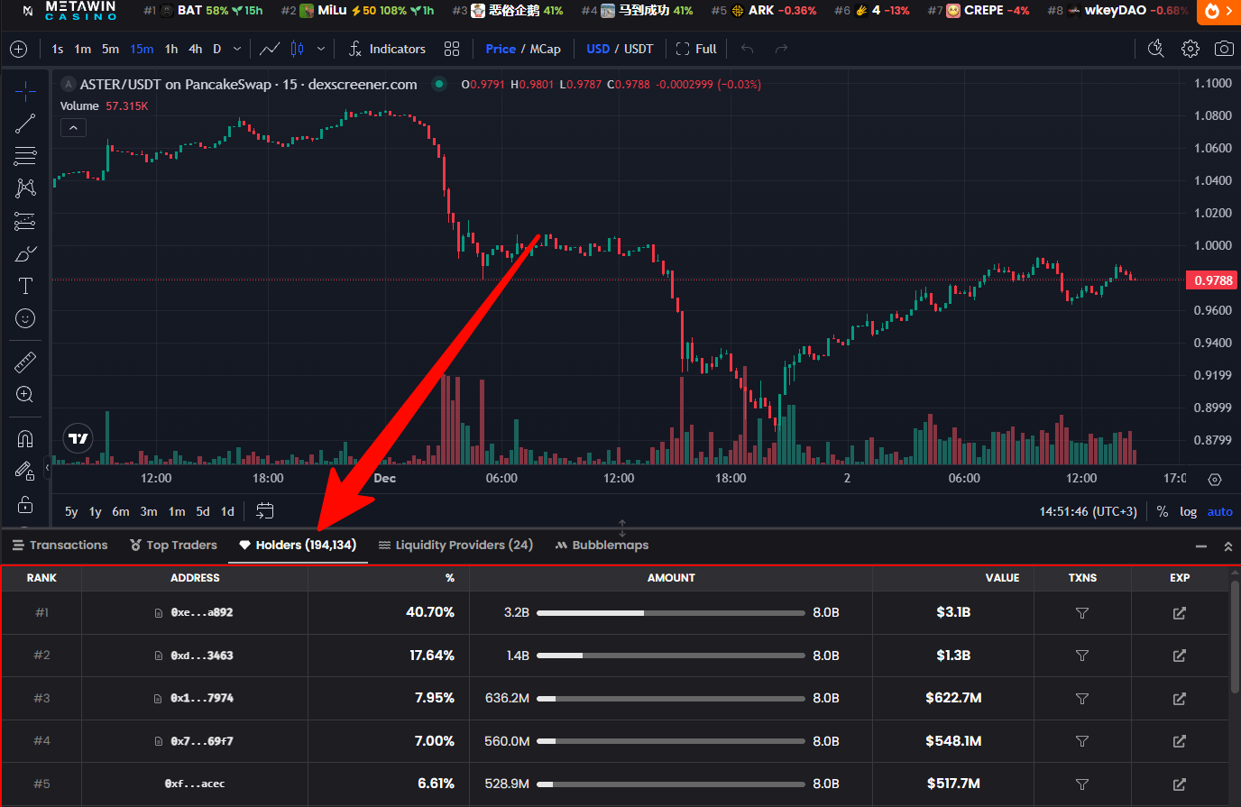 Например: в текущей паре ASTER/USDT существует 87 поставщиков ликвидности, из которых на самый крупный кошелёк приходится 30%, а на второй 20%. Это говорит о том, что большая часть ликвидности по-прежнему сосредоточена в нескольких крупных кошельках. Инвесторам следует внимательно следить за ситуацией, чтобы избежать рисков при выводе средств с этих кошельков.