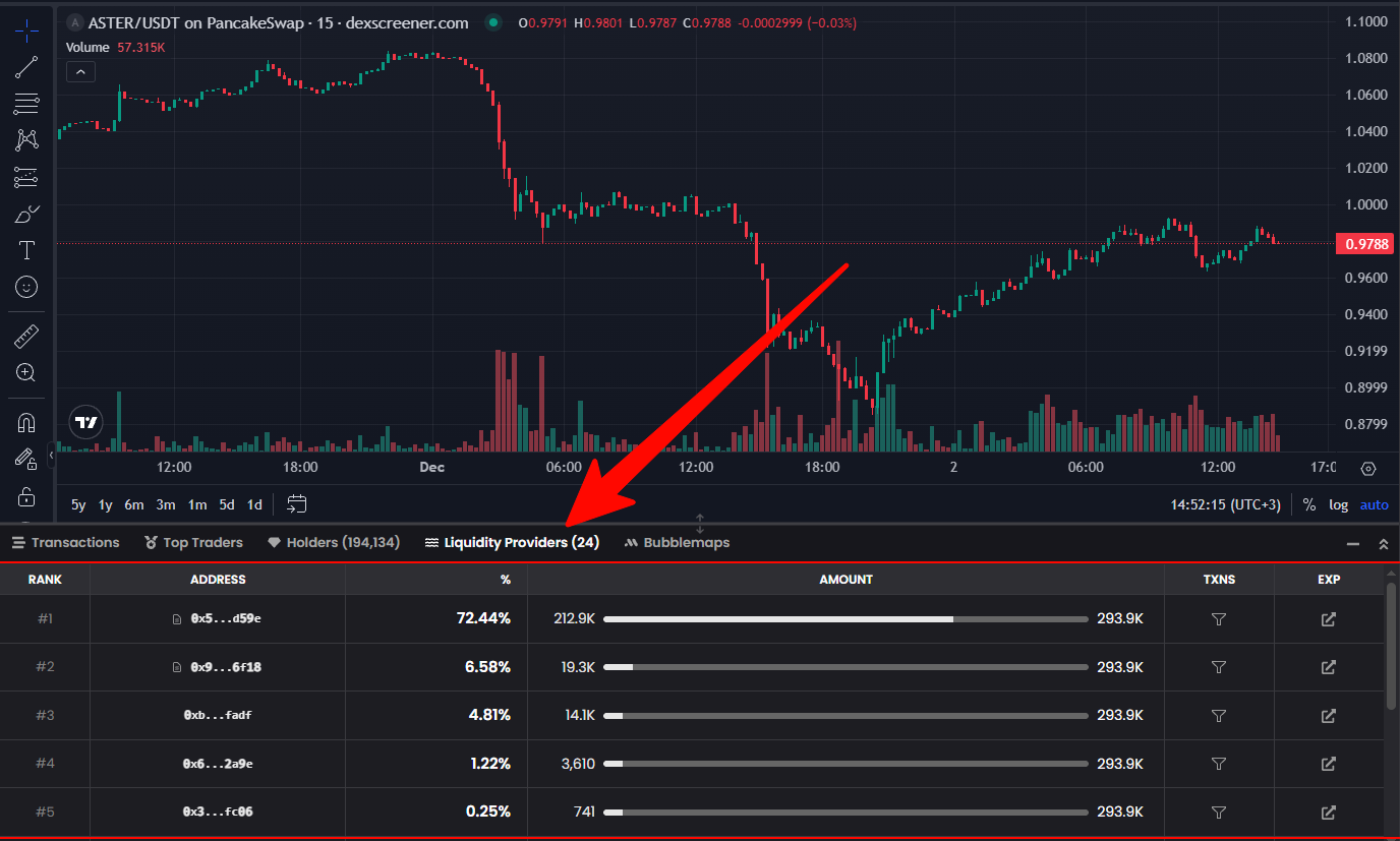 Поставщики ликвидности — это раздел, в котором отображается список кошельков, участвующих в предоставлении ликвидности (LP) для торговой пары, а также процентный вклад и количество токенов, заблокированных в пуле.