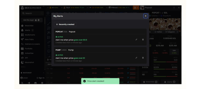 Вы также можете настроить другие параметры, такие как капитализация или цена по SOL, а также период колебания цен. Система поддерживает отправку уведомлений по электронной почте или push-уведомлений при использовании приложения на телефоне, что позволяет вам следить за рынком в любое время и в любом месте. В настоящее время функция оповещений предоставляется бесплатно, но с ограниченным количеством; в будущем, вероятно, появится премиум-пакет для продвинутых пользователей, которым необходимо управлять большим количеством оповещений.
