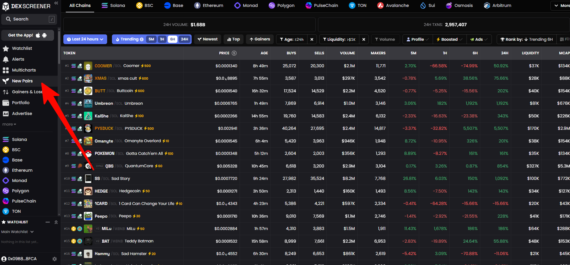 В разделе «Новые пары» на Dexscreener представлены токены, которые только что приобрели ликвидность, что позволяет инвесторам искать возможности уже на ранних этапах. Здесь вы можете фильтровать по блокчейну (Solana, BSC, Ethereum…), времени (5 мин, 1 ч, 24 ч…) или установить пороговое значение объёма/ликвидности, чтобы сузить выборку значимых токенов.