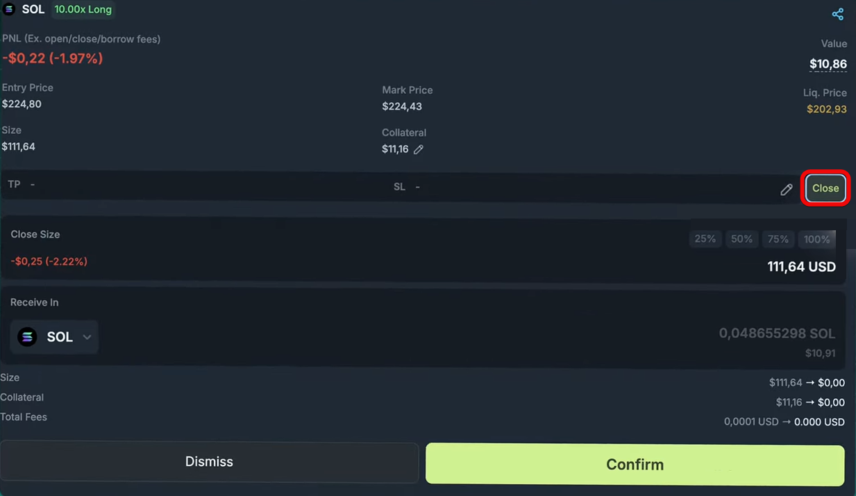 Если вы решите закрыть позицию, просто нажмите Close, подтвердите закрытие во всплывающем окне, а затем подтвердите в кошельке.