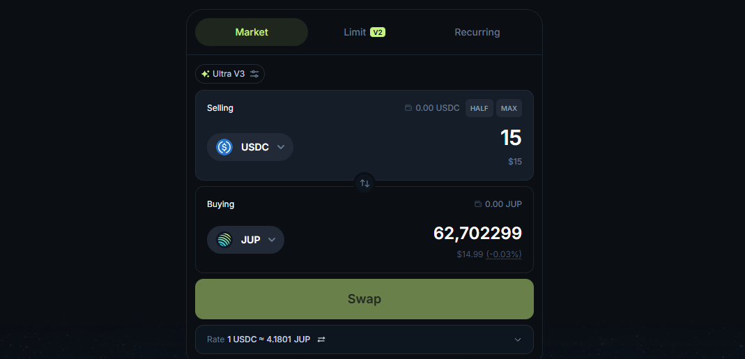 Чтобы выполнить своп, давайте проведем тестовую транзакцию, чтобы вы поняли принцип, после чего мы двинемся дальше. Для начала введите, что хотите купить JUP, например, на 15 $ в USDC; вы сразу увидите, сколько получите.