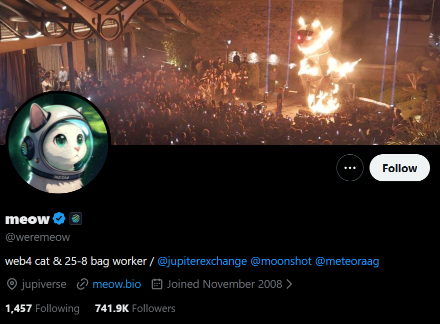 После знакомства с основными продуктами экосистемы, познакомимся с ее создателем - человеком с 740,000 подписчиков под ником Meow в X/Twitter.