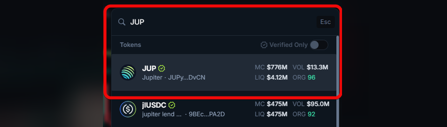 Например, на странице токена JUP видны его название, верификация, органический индекс (активность без ботов, ORG), капитализация, ликвидность, объем торгов за 24 часа.