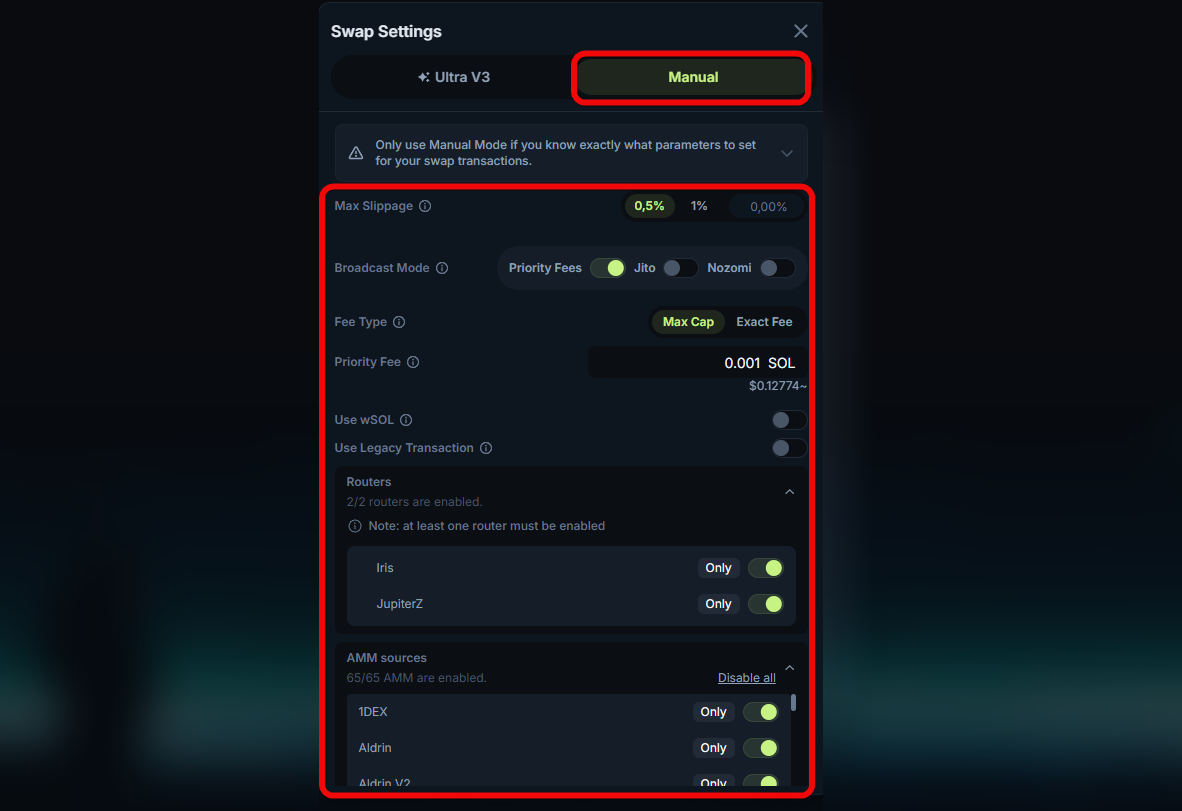Режим Ultrav3 оптимизирует процесс обмена с минимальным вашим участием: интерфейс автоматически выбирает лучшие маршруты для обмена, минимизирует процент отклонения цены (проскальзывание) и обеспечивает быстрые транзакции. Этот режим идеально подходит для начинающих.