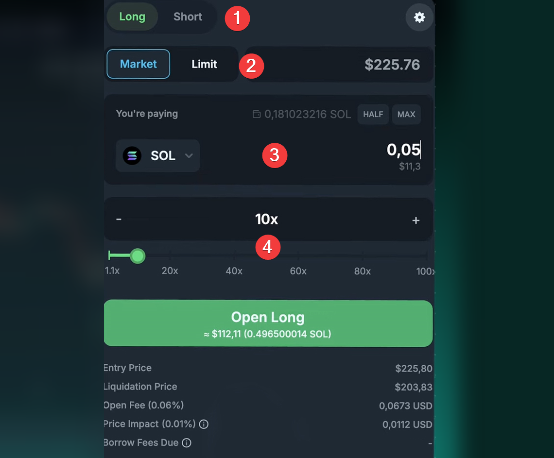 Если вы решите открыть позицию, нажмите Open Long, подтвердите в кошельке, подождите несколько секунд - и все готово; ваша позиция отобразится прямо под графиком.