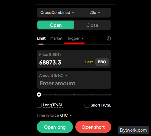 Вы можете выбрать, на какую цену ориентироваться для срабатывания триггера - на цену последней сделки (Last Price) или на цену маркировки (Mark Price).