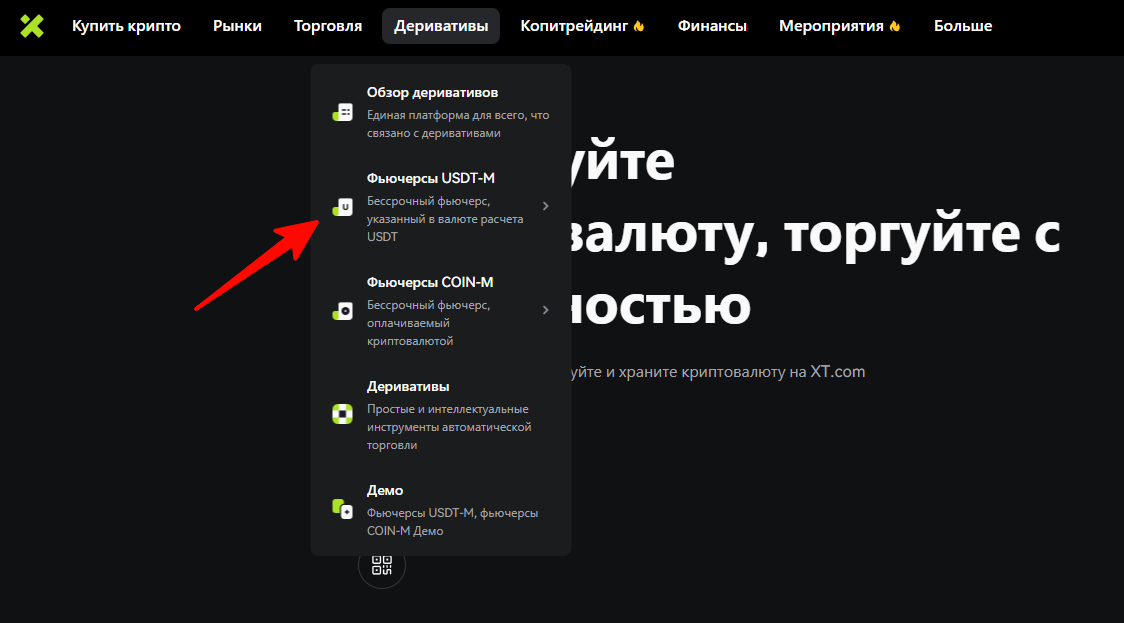 Для того, чтобы перейти в раздел торгов с плечом, нажмите на кнопку «Деривативы» и в всплывающем меню выберите «Фьючерсы USDT-m».
