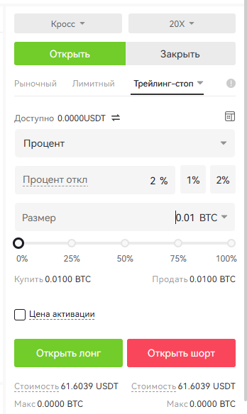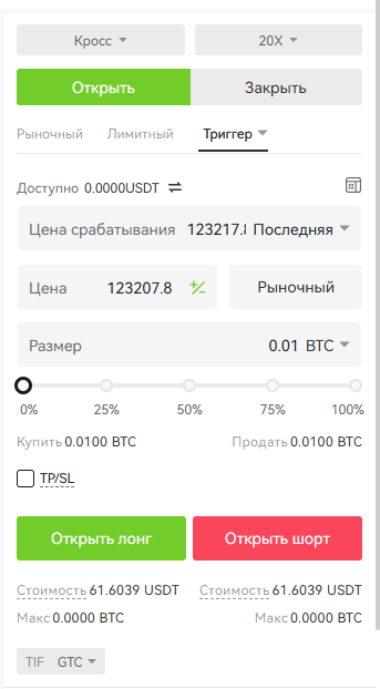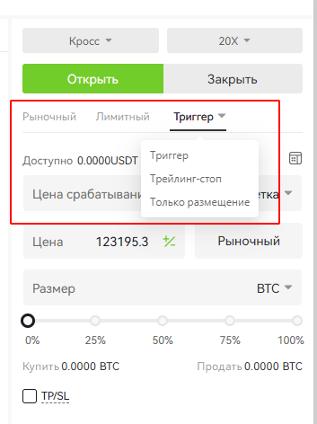 Для создания триггерного ордера трейдеру необходимо сначала ввести цену срабатывания (триггерная цена), перед вводом цены и количества. Затем начать «Открыть лонг» или «Открыть шорт».