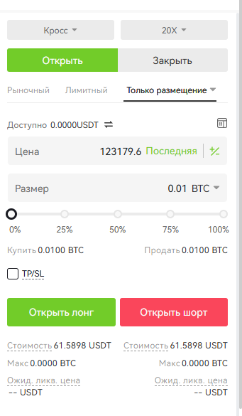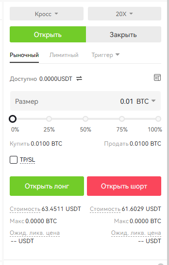Введите цену и количество, нажмите «Открыть лонг» или «Открыть шорт»