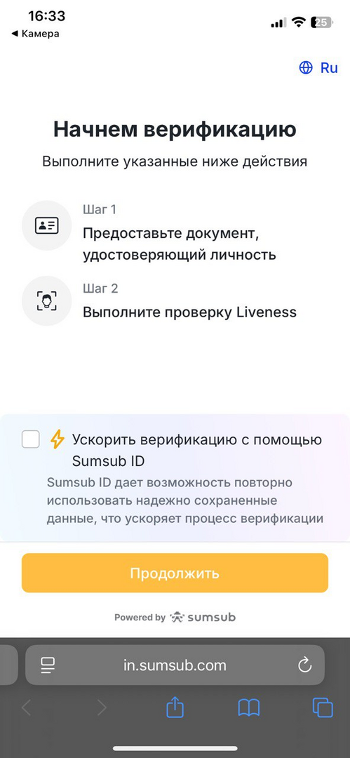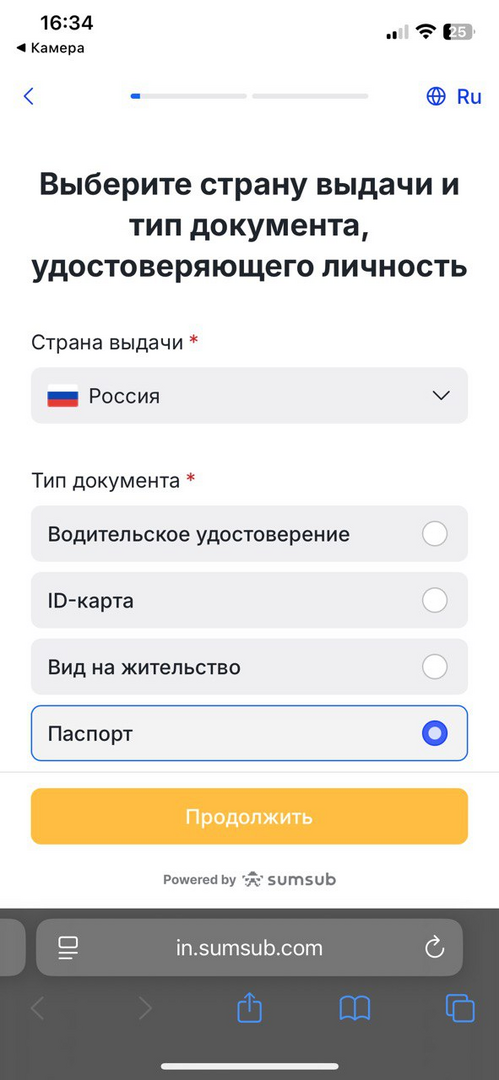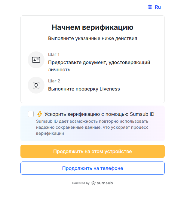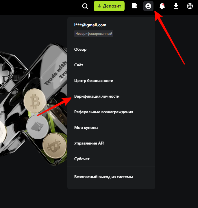 Для прохождения KYC нажмите на значок человечка в верхнем правом углу и в выпадающем меню выберите «Верификация личности».