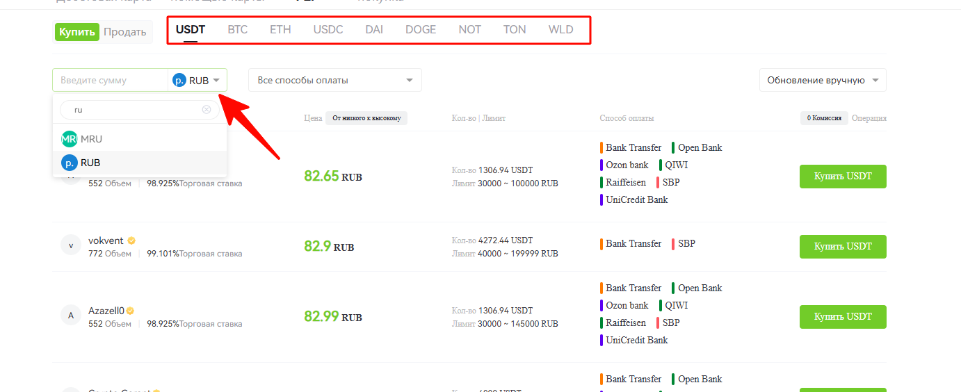 Откроется новая страница. На ней обязательно выберите Валюту Рубли и обязательно выберите криптовалюту, которую хотите получить, к примеру USDT.