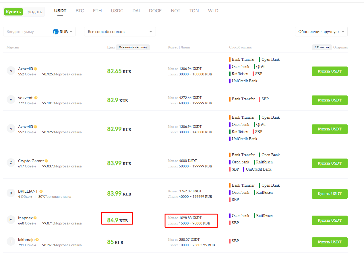 Нажмите на кнопку «Купить Крипто» и в всплывающем меню выберите раздел «Торговля P2P».