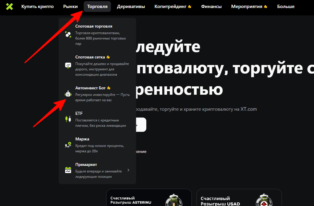 Нажмите на торговля и в выпадающем списке выберите «Автоинвест Бот».