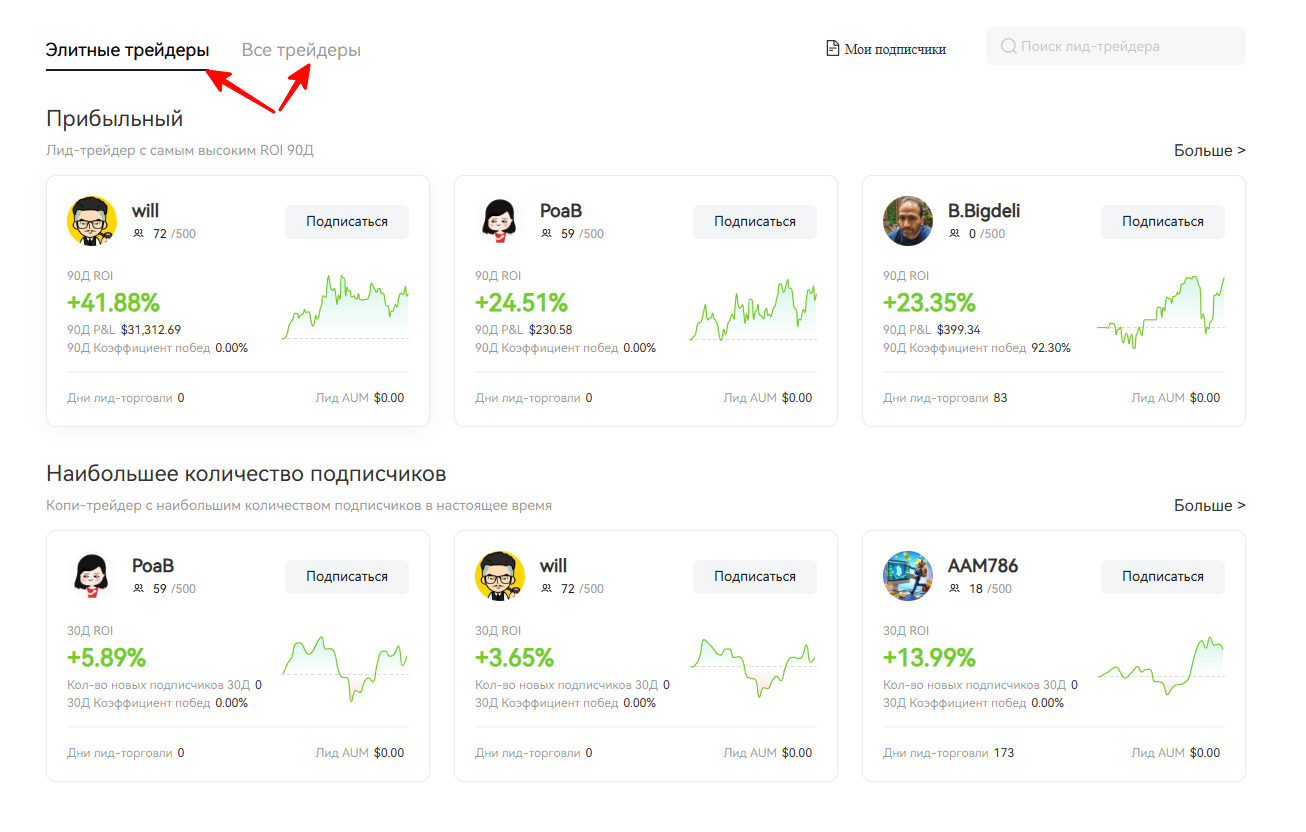 Откроется новая страница. На ней Вы можете ознакомиться с лидерами копи трейдинга, а также со всеми участниками.