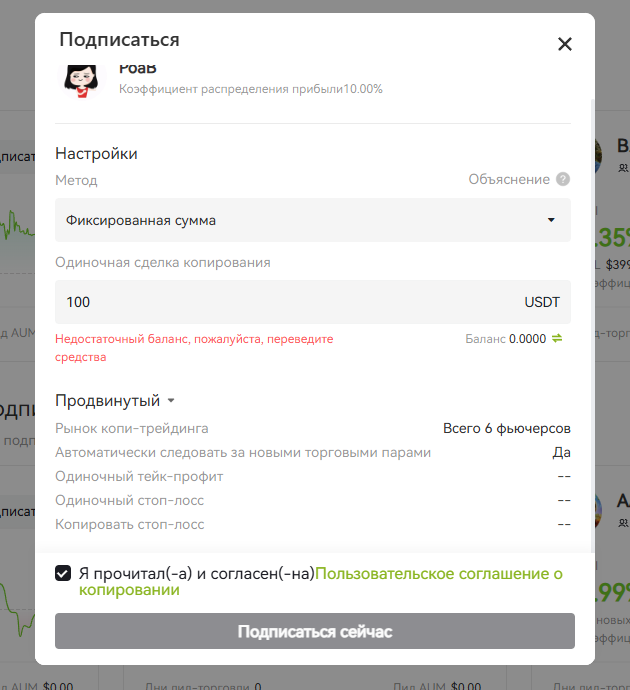 Откроется всплывающее окно, в нем укажите сумму, которую Вы готовы потратить на копирование сделок выбранного трейдера.
