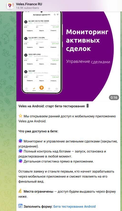 Создавать, следить и управлять торговыми ботами стало намного проще! Платформа по созданию торговых крипто ботов Veles Finance выпустила мобильное приложение, позволяющее управлять им с Вашего смартфона!