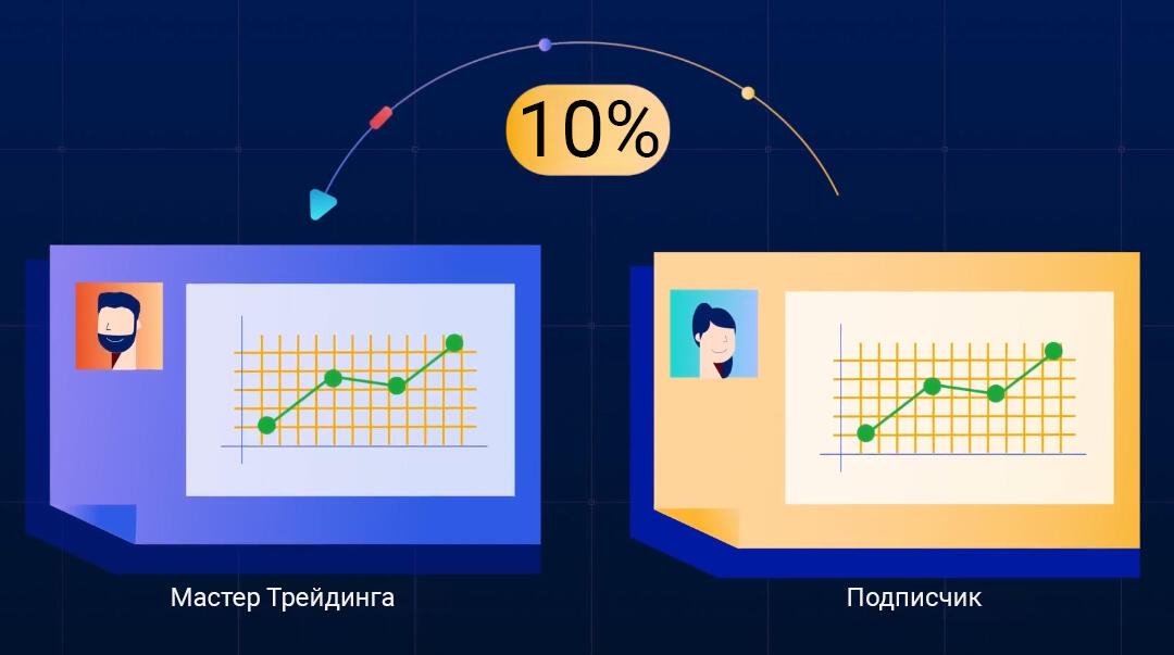 Подписчики получают доход от копирования успешных сделок, а мастера трейдинга - 10 % от общей прибыли своих подписчиков.