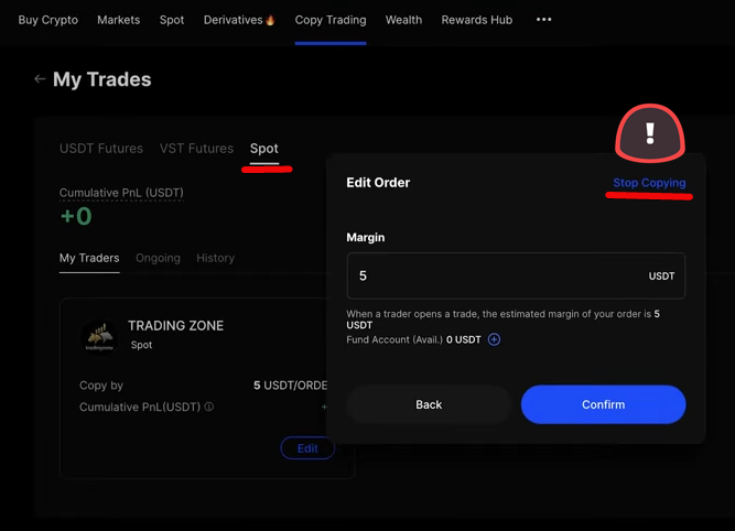 При необходимости, во вкладке Spot можно изменить сумму или маржу, а кнопка Stop Copying мгновенно прекращает копирование.