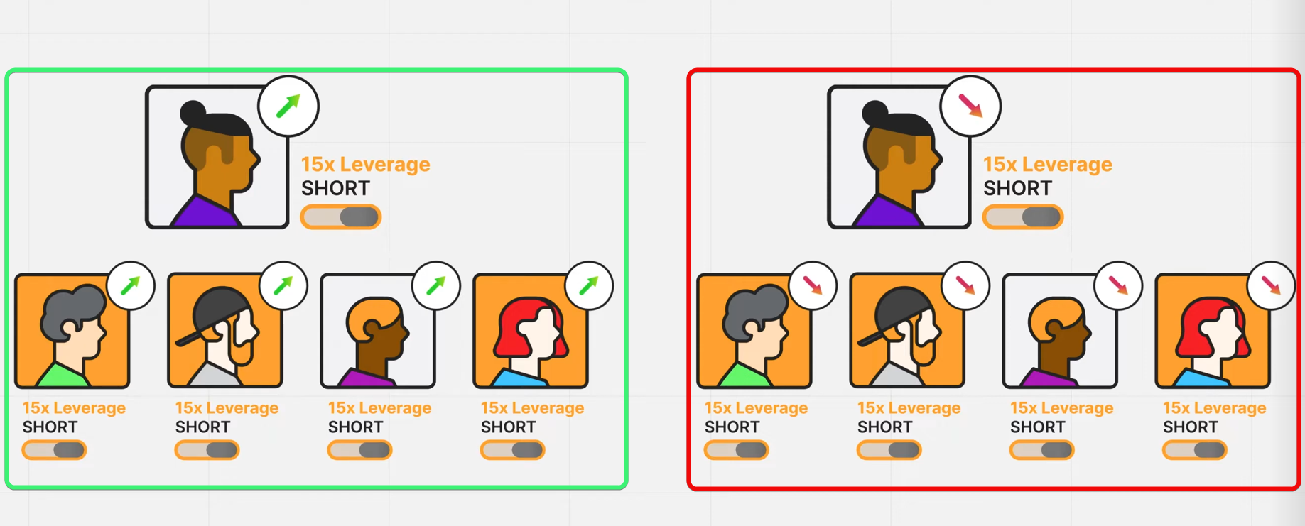 Например, если подписчик выбрал Мастер Трейдера с ником Сатоши, и Сатоши открывает 15-кратную короткую позицию на Ethereum, все подписчики автоматически откроют такую же позицию на выбранную ими сумму.