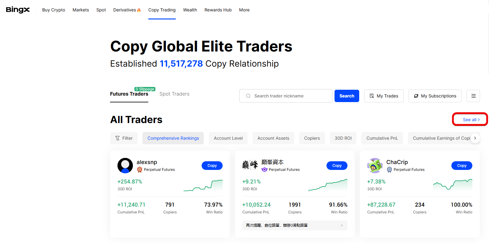 Перейдите в раздел копитрейдинга на бирже и посмотрите предложения, здесь их тысячи, если нажать See All.