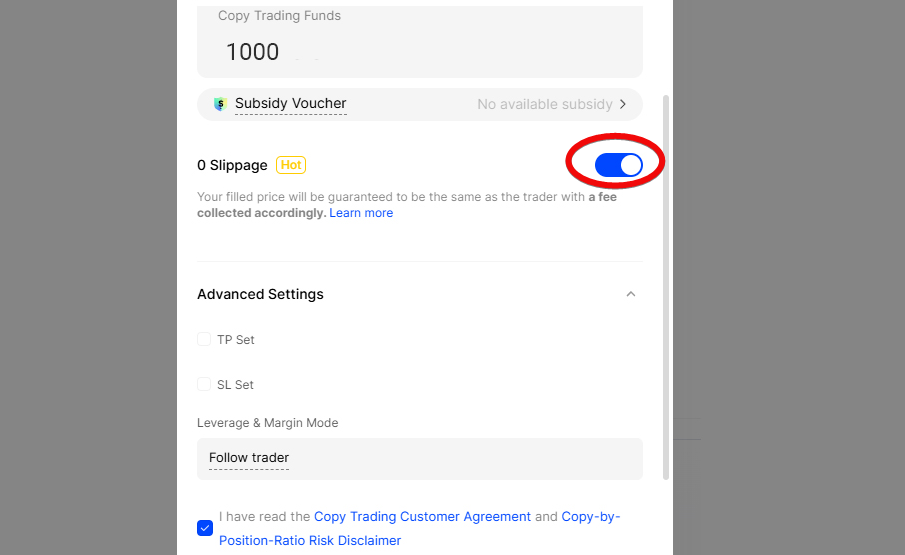 Далее укажите долю своего капитала, например 1 000 $, включите нулевое проскальзывание, оставьте поля тейк-профита и стоп-лосса пустыми, чтобы полностью синхронизироваться со стратегией трейдера. Здесь так же важно включить нулевое проскальзывание.