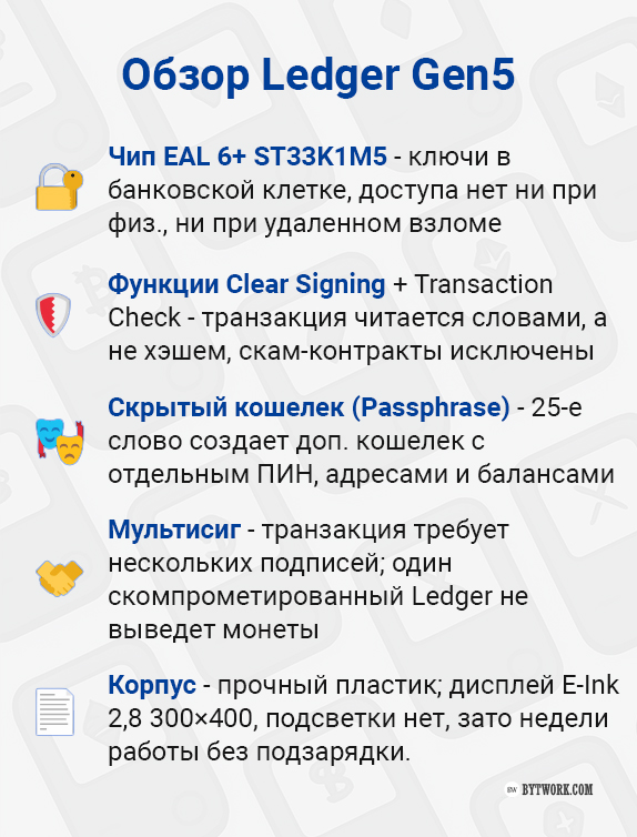 | Ledger Recovery Key | Нет | Нет | Да (в комплекте) | Да (в комплекте) | Да (в комплекте) |