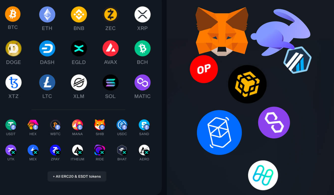 Поддержка монет включает такие как BTC, ETH, BNB, ZEC, XRP, DOGE, DASH, EGLD, XTZ, LTC, BCH, AVAX, XLM, SOL и POL