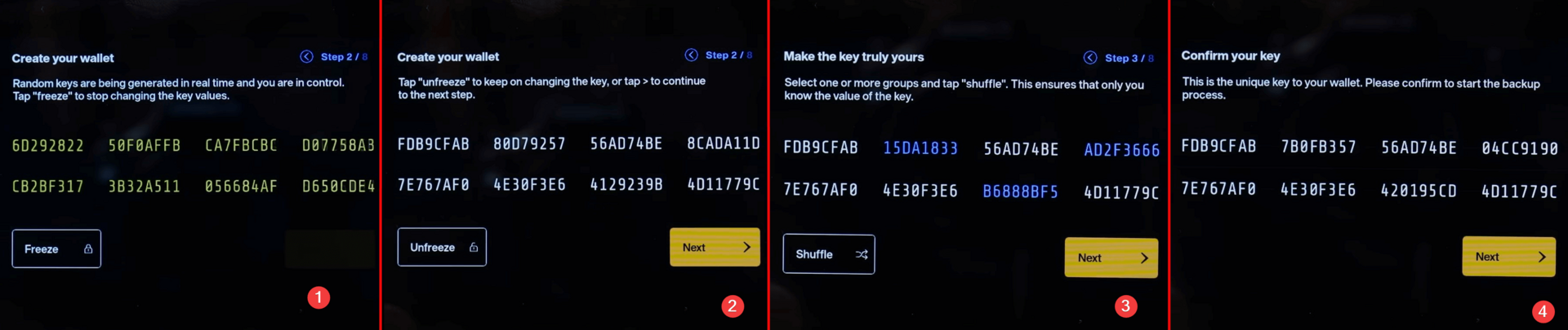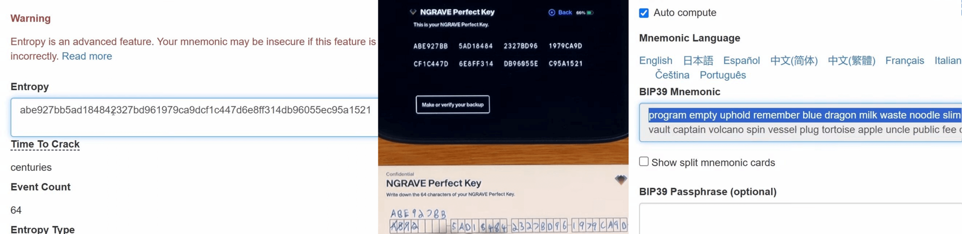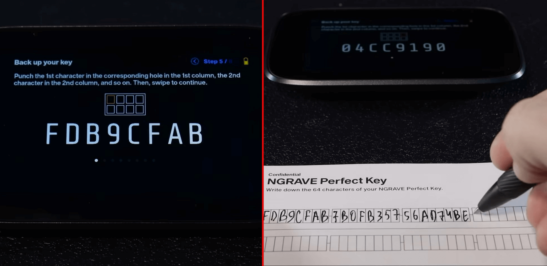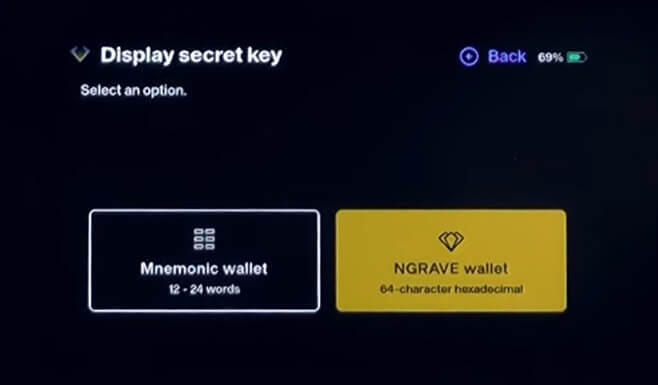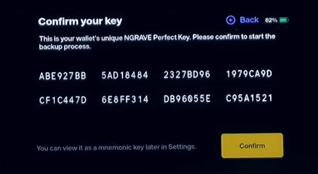Странность вторая - вместо привычной 24-словной фразы, вам предложат выгравировать или переписать 64-символьную шестнадцатеричную строку. Однако это все та же фраза BIP-39! Т.е. по сути ничего не изменится, кроме увеличения риска ошибки при переписывании.