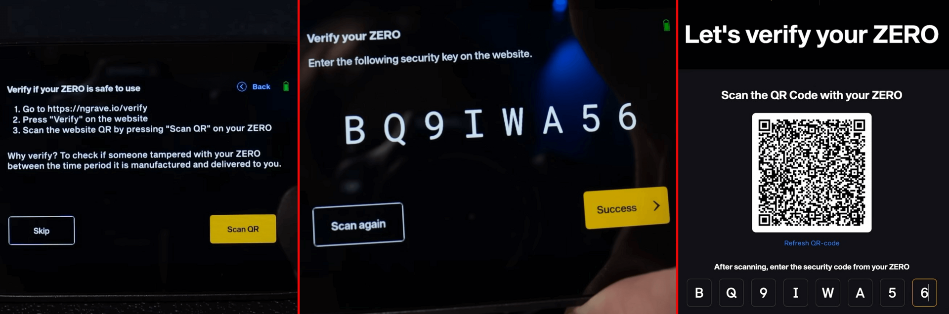 Для этого откройте браузер и перейдите по адресу ngrave.io/en/verify, затем с помощью кошелька отсканируйте QR-код, отображаемый на странице проверки.