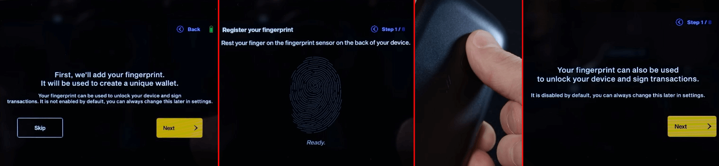 При желании зарегистрируйте отпечаток пальца - приложите палец к сенсору на задней панели. Появится подтверждение, что биометрия может разблокировать устройство и подписывать транзакции.