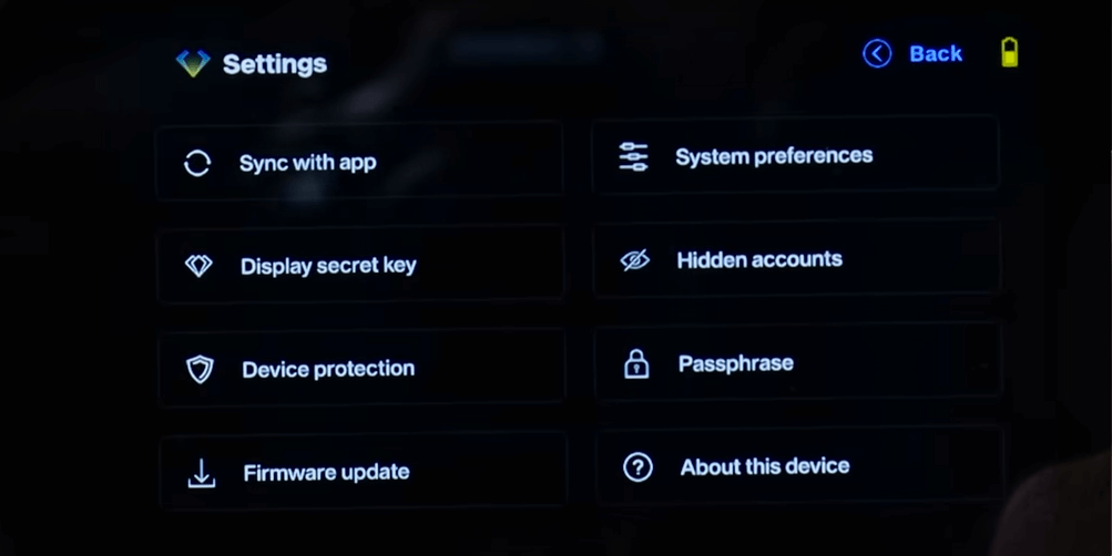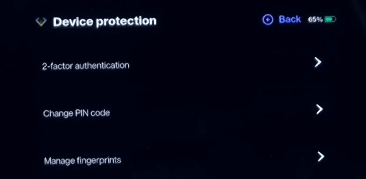 В настройках можно просмотреть сид-фразу, изменить ПИН-код, отпечатки пальцев, параметры двухфакторной аутентификации, установить время блокировки экрана или полностью стереть данные.