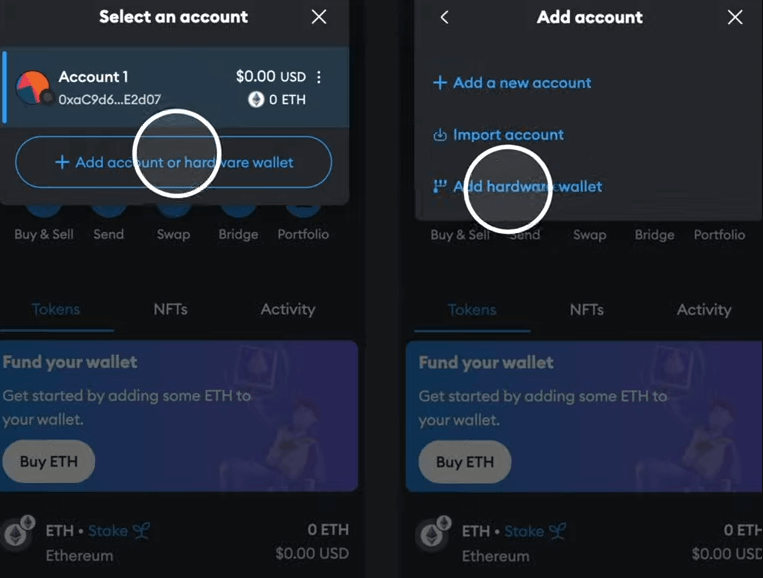 В MetaMask нажмите на аккаунт → Add account or hardware wallet