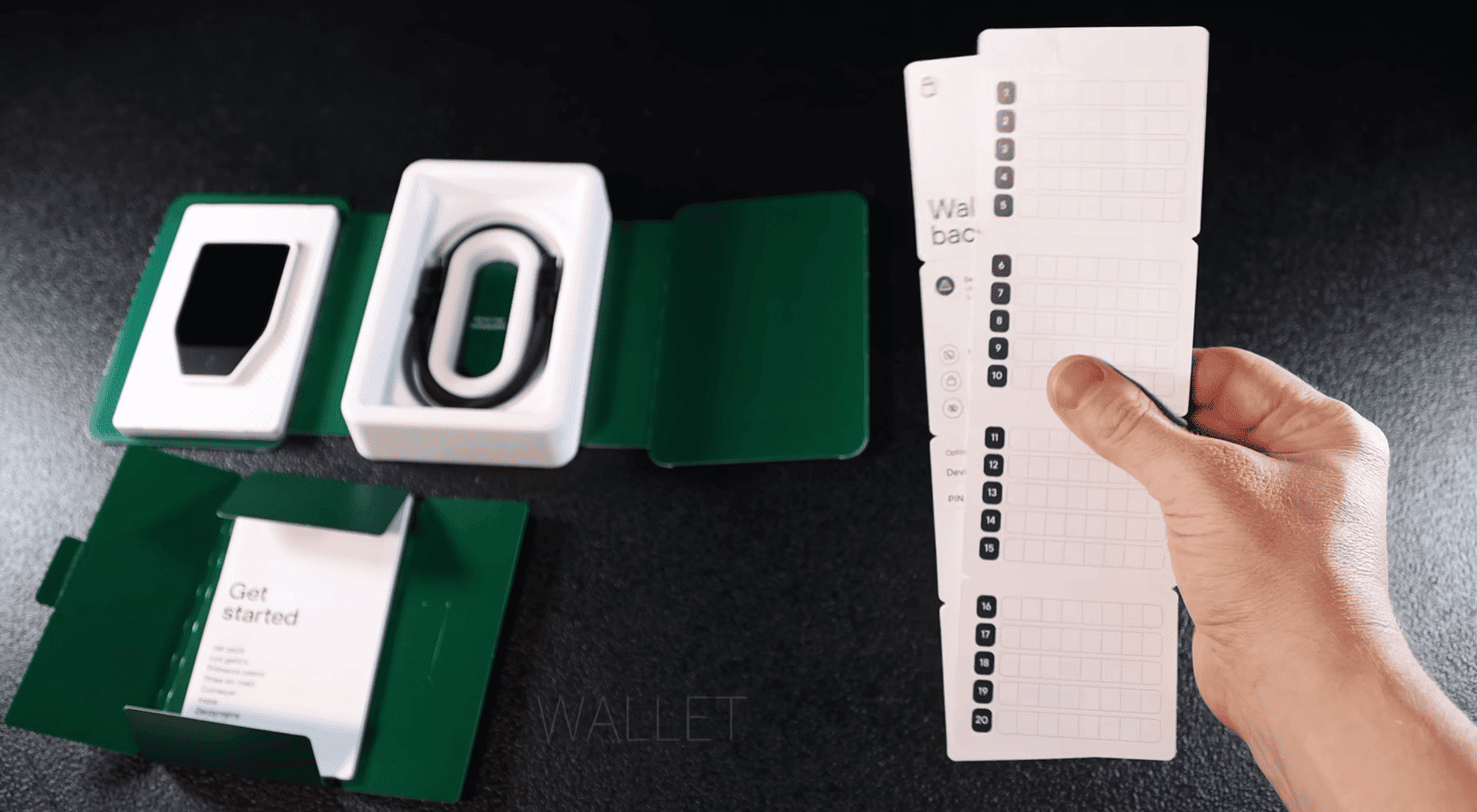 В комплектацию входят: сам аппаратник, кабель USB-C, многоязычное руководство, 2 карточки для сид-фразы, инструкция по безопасности и набор стикеров.